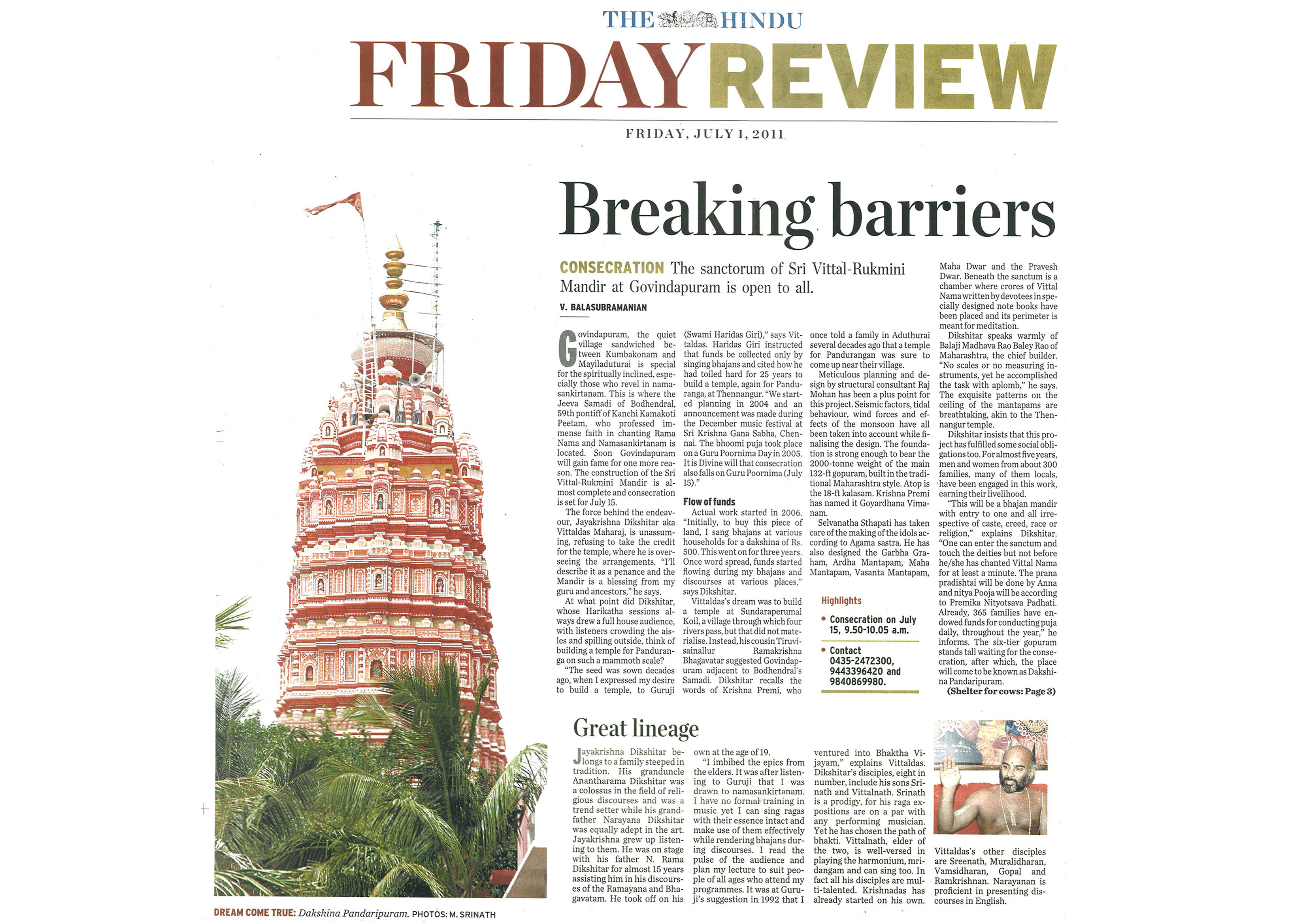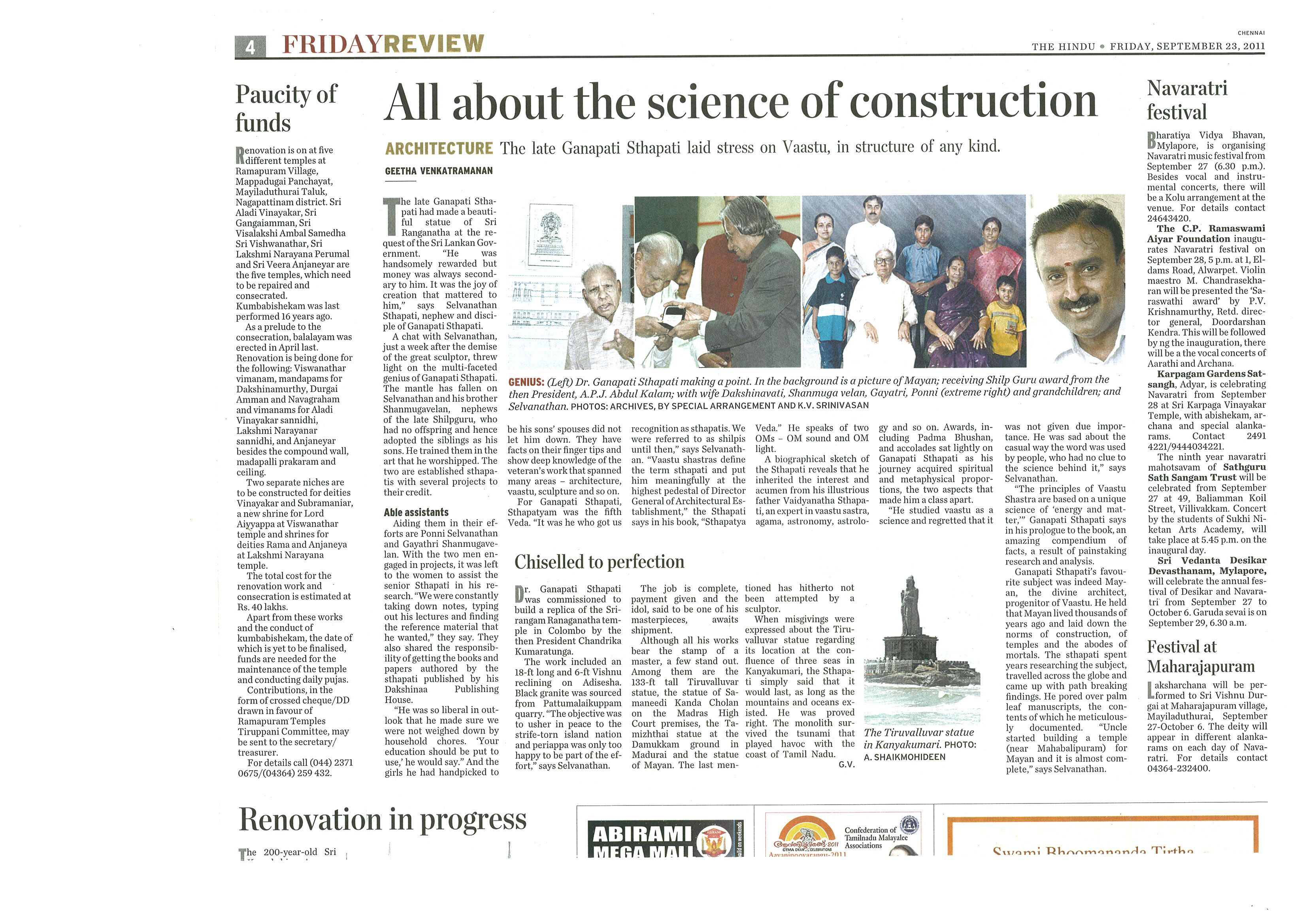 The kumbabhishekam of Sulur Thirupathi was performed on September 11 under the presidency of a Bhattacharya of T.T.Devasthanams, Tirupathi, in the presence of Sivacharyas of various mutts in Tamil Nadu. Of the 108 Vaishnava shrines, only three face north – Uraiyur, Ayodhya and Salagram (Nepal). The Sulur Thirupathi temple too faces north.